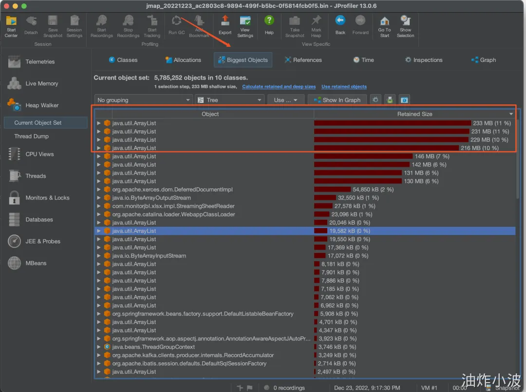然后使用JPofiler进行内存分析。(JProfiler是一款堆内存分析工具,可以直接连接线上jvm实时查看相关信息,也可以分析dump出来的堆内存快照,对某一时刻的堆内存情况进行分析)