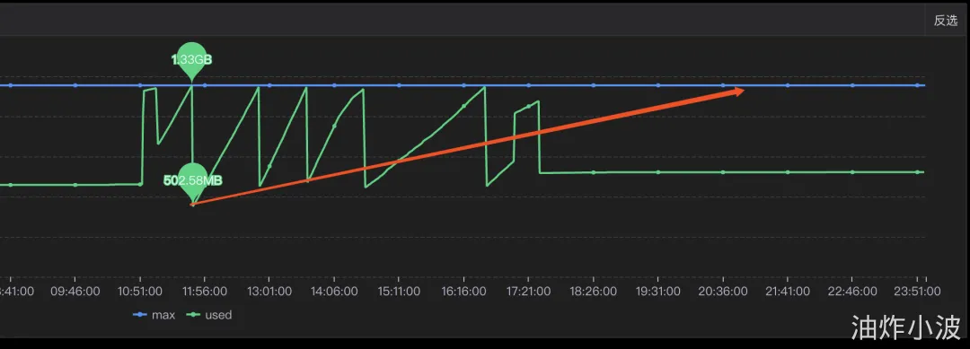 其中一个现象是每次gc后的最小内存正在逐步变大,对应上述步骤中第二步,内存正在逐步膨胀。