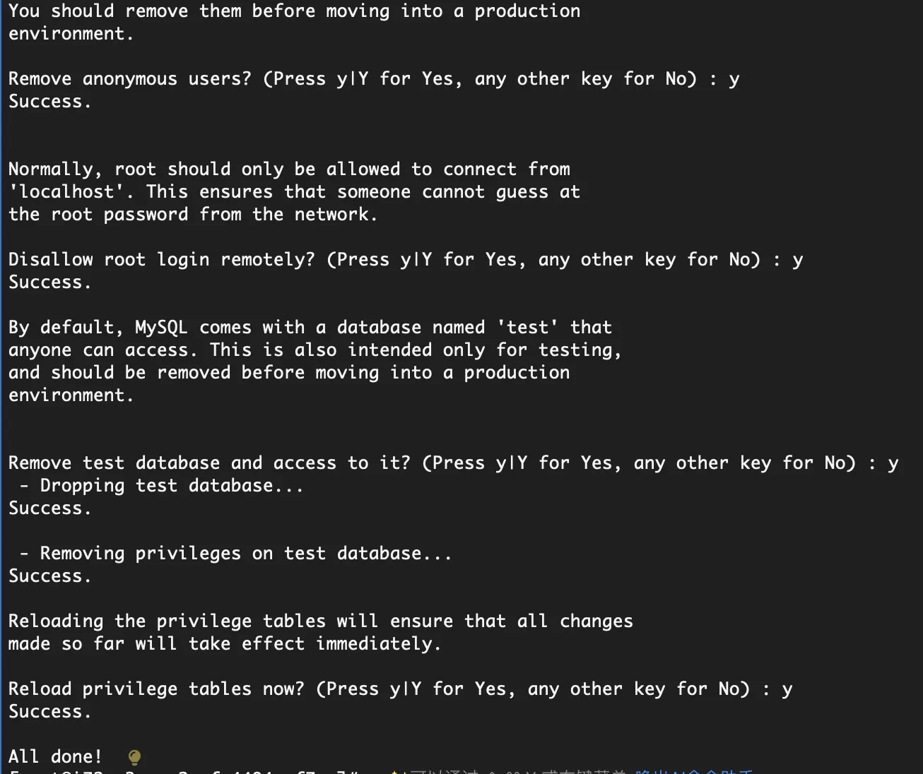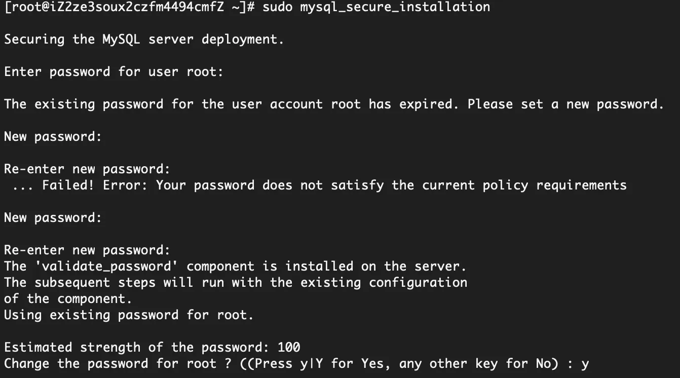 安装完 MySQL 并获取到默认 root 密码后,接下来需要进行一次安全初始化配置,主要是为了提升数据库的安全性。