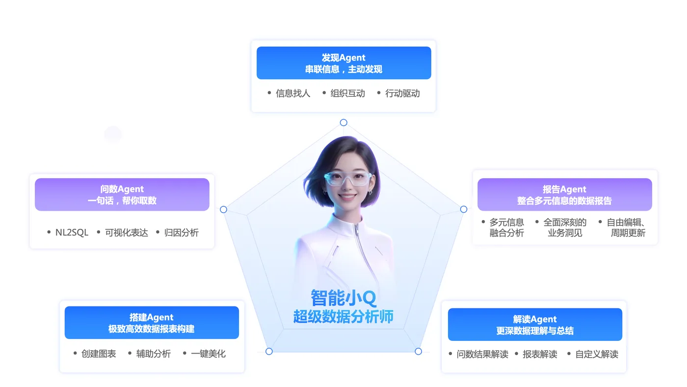 - 智能问数(ChatBI):通过自然语言交互,允许用户像和人类对话一样向系统提问,由系统即时理解并返回准确的分析结果,所有人都可以随时随地的获取数据。