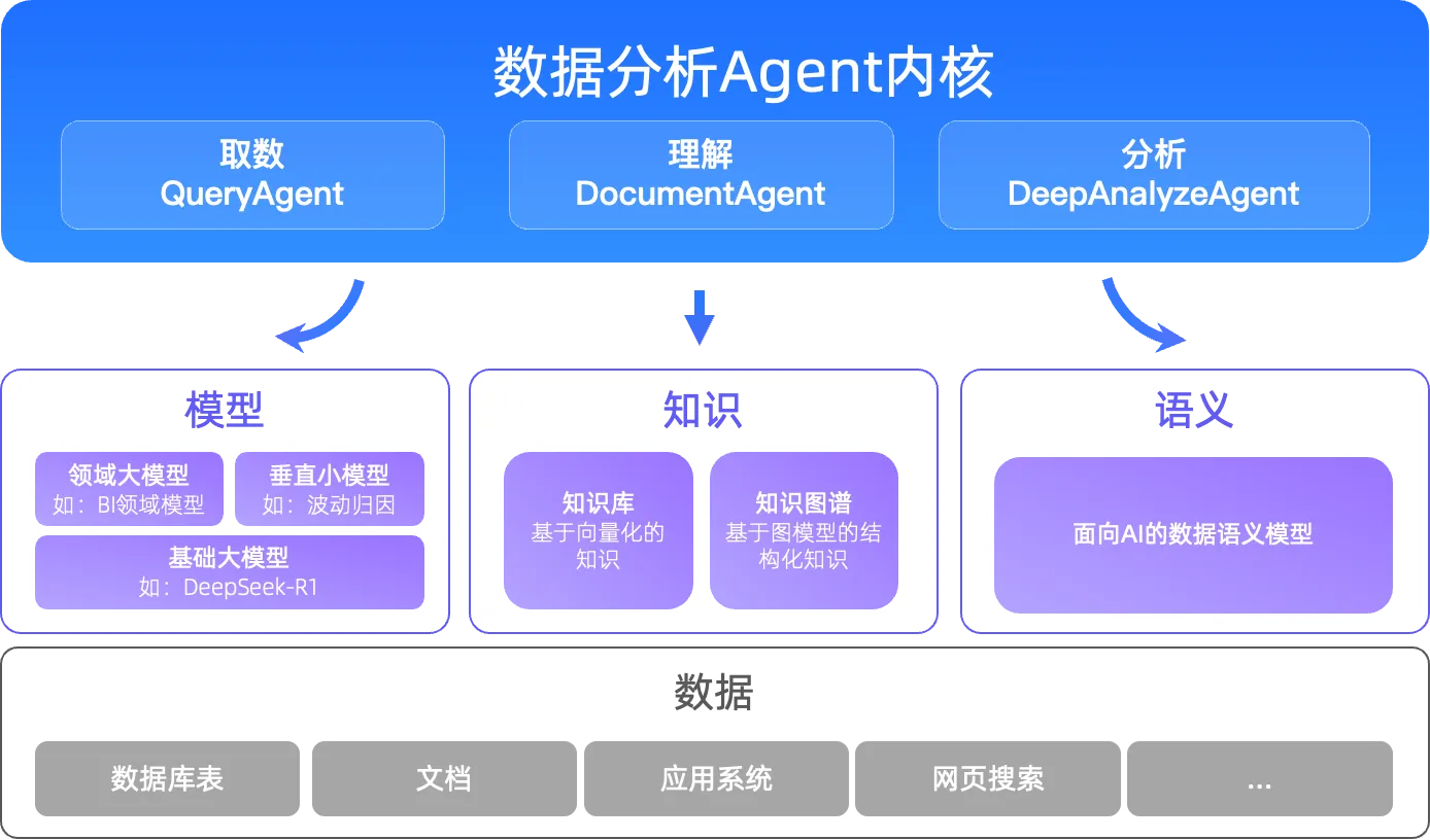 2023年,LLM突破自然语言理解瓶颈,使对话取数成为可能,问答BI(ChatBI)成为业界普遍方向;2025年,Agent技术的发展赋予了AI系统自主规划、执行、反思的能力,数据分析Agent也成长为能够理解业务需求、自主处理数据、生成专业洞察的企业级智能助手。