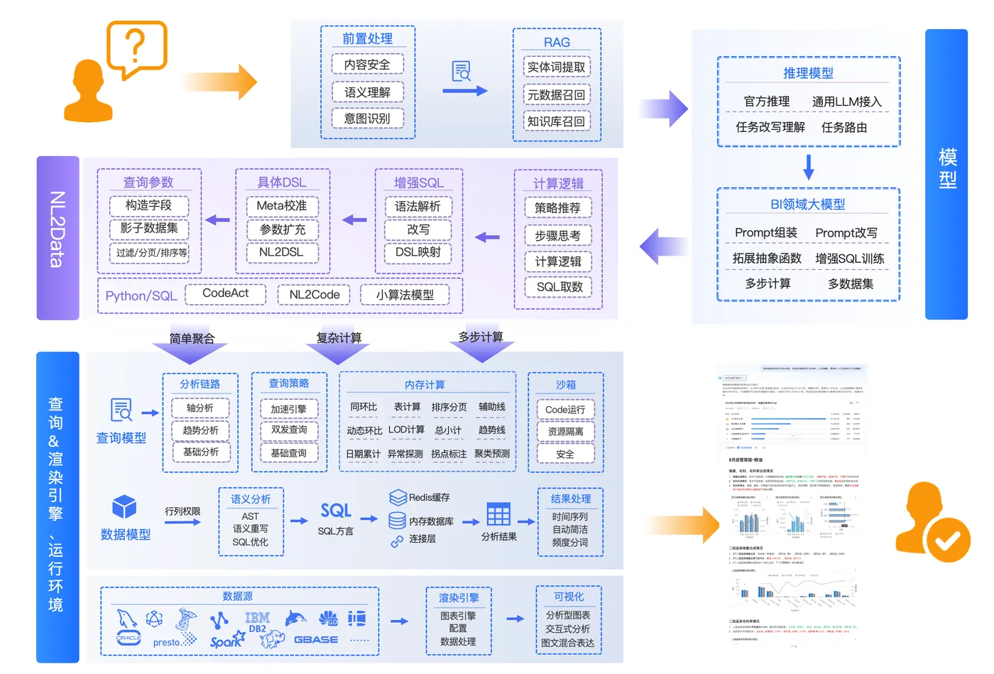 - NL2DSL:通过大模型将用户的自然语言问题转换为BI领域结构化语言(DSL),然后由BI分析引擎转换为结构化查询语言(SQL),使数据库能够理解并返回数据查询结果。因此也有NL2DSL2SQL的说法。