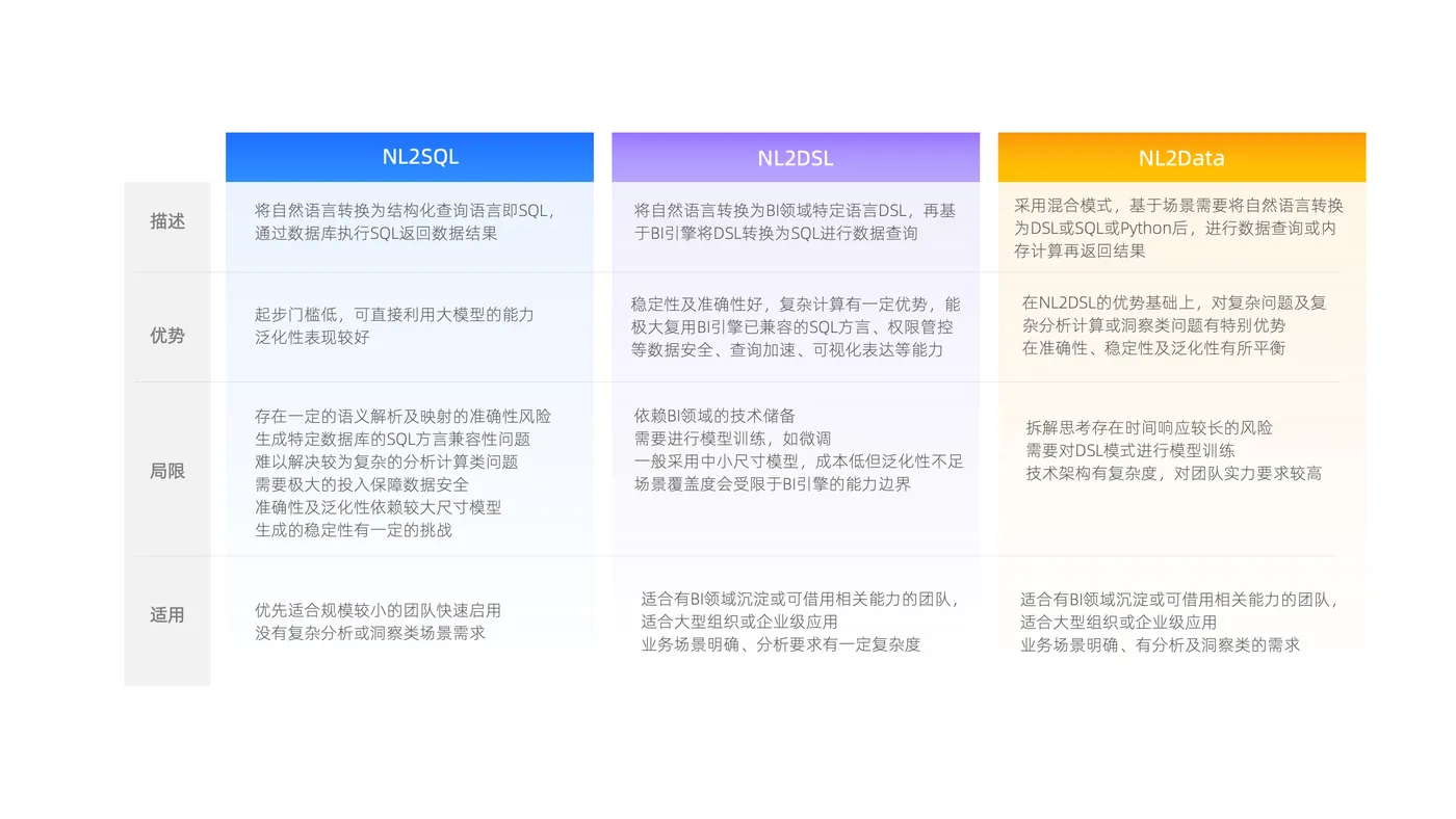 当前主流的智能问数技术路线是NL2SQL和NL2DSL,同时有技术实力的团队进入到更具融合性的阶段,也被统称为NL2Data技术路线。
