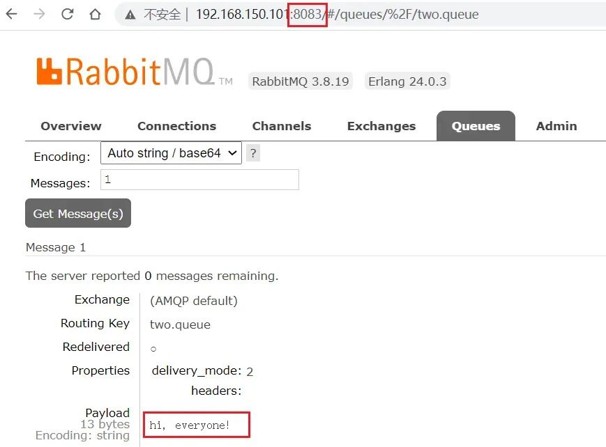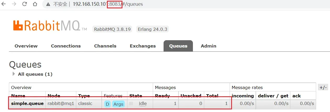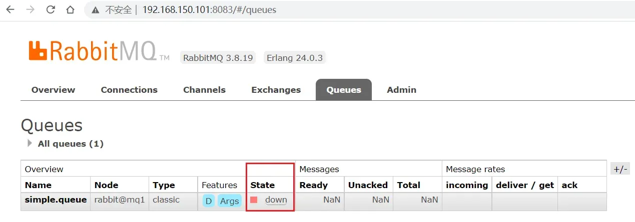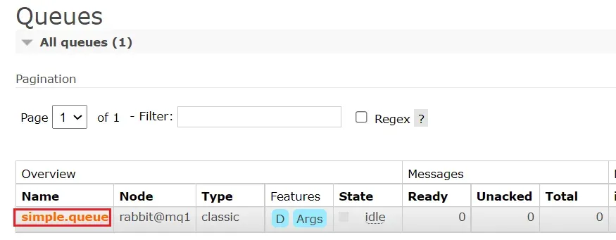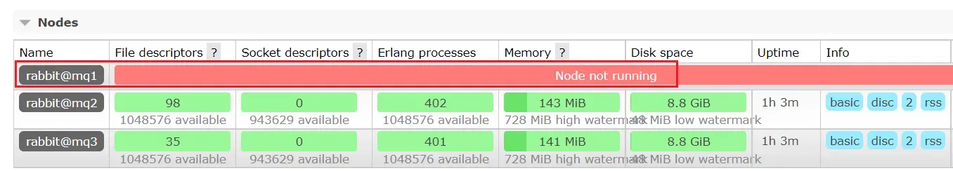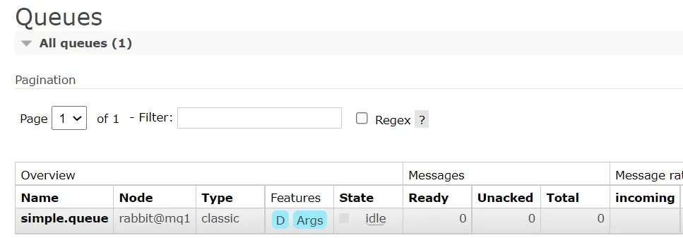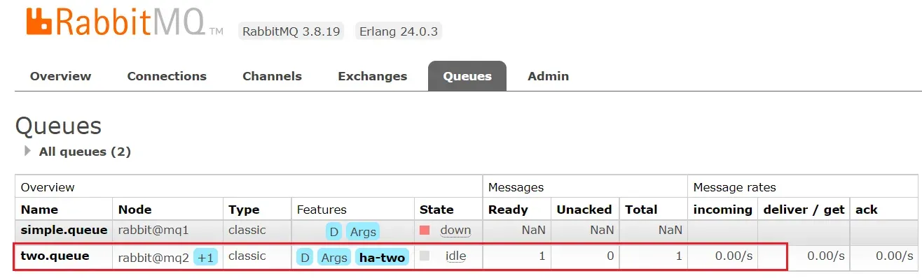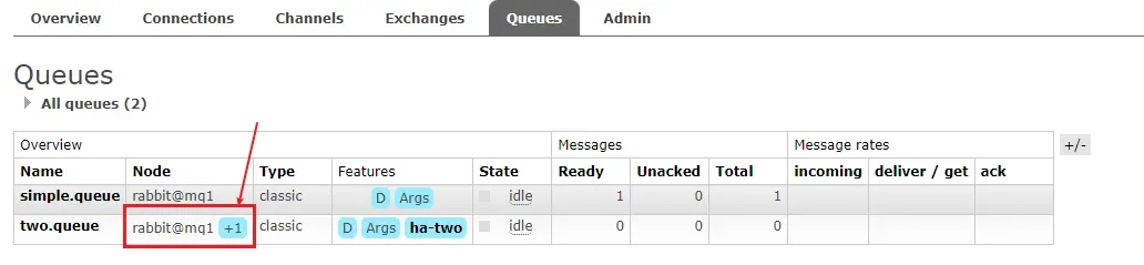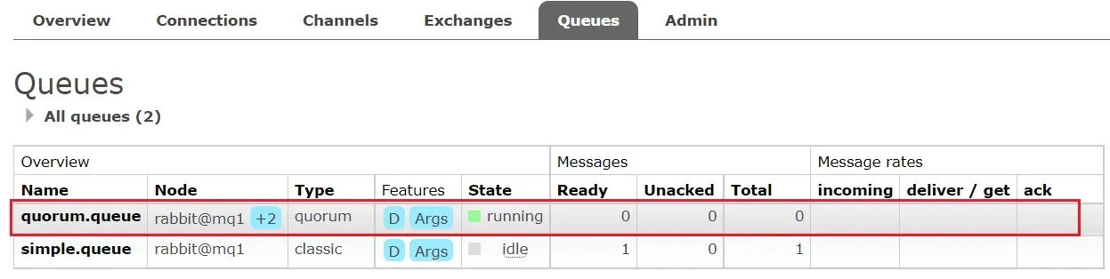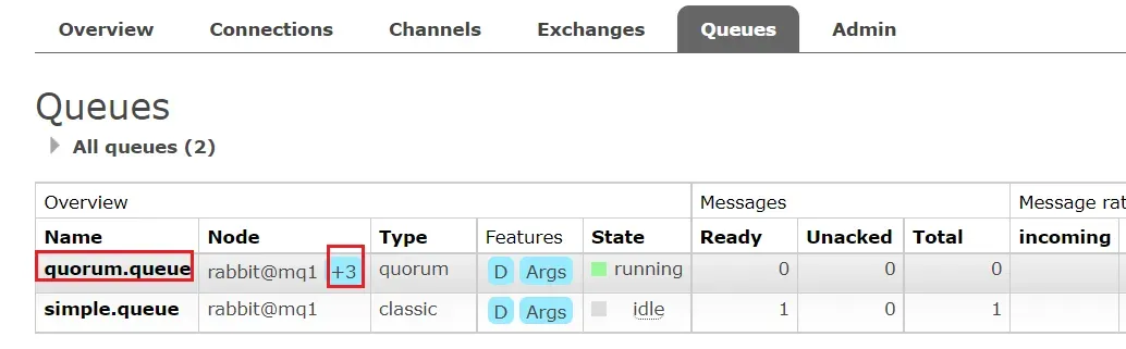 可以看到,仲裁队列的 + 2字样。代表这个队列有2个镜像节点。因为仲裁队列默认的镜像数为5。如果你的集群有7个节点,那么镜像数肯定是5;而我们集群只有3个节点,因此镜像数量就是3.
