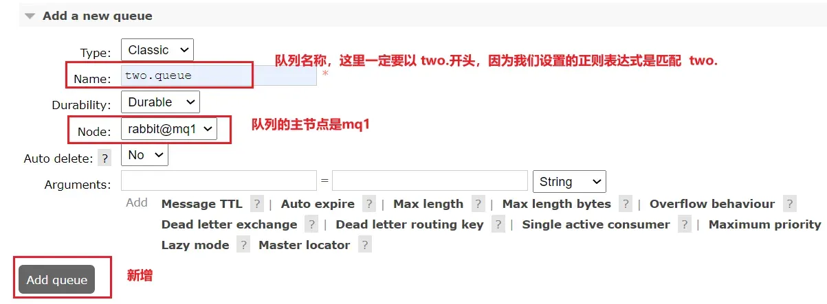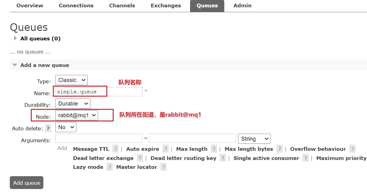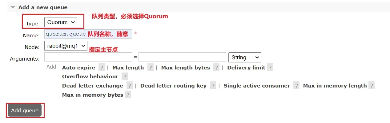 在任意控制台添加一个队列,一定要选择队列类型为Quorum类型。