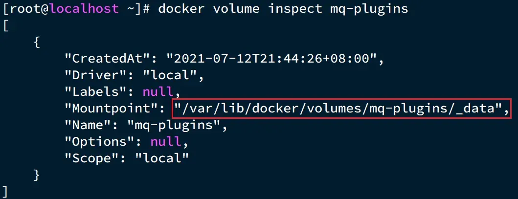 我们之前设定的RabbitMQ的数据卷名称为mq-plugins,所以我们使用下面命令查看数据卷: