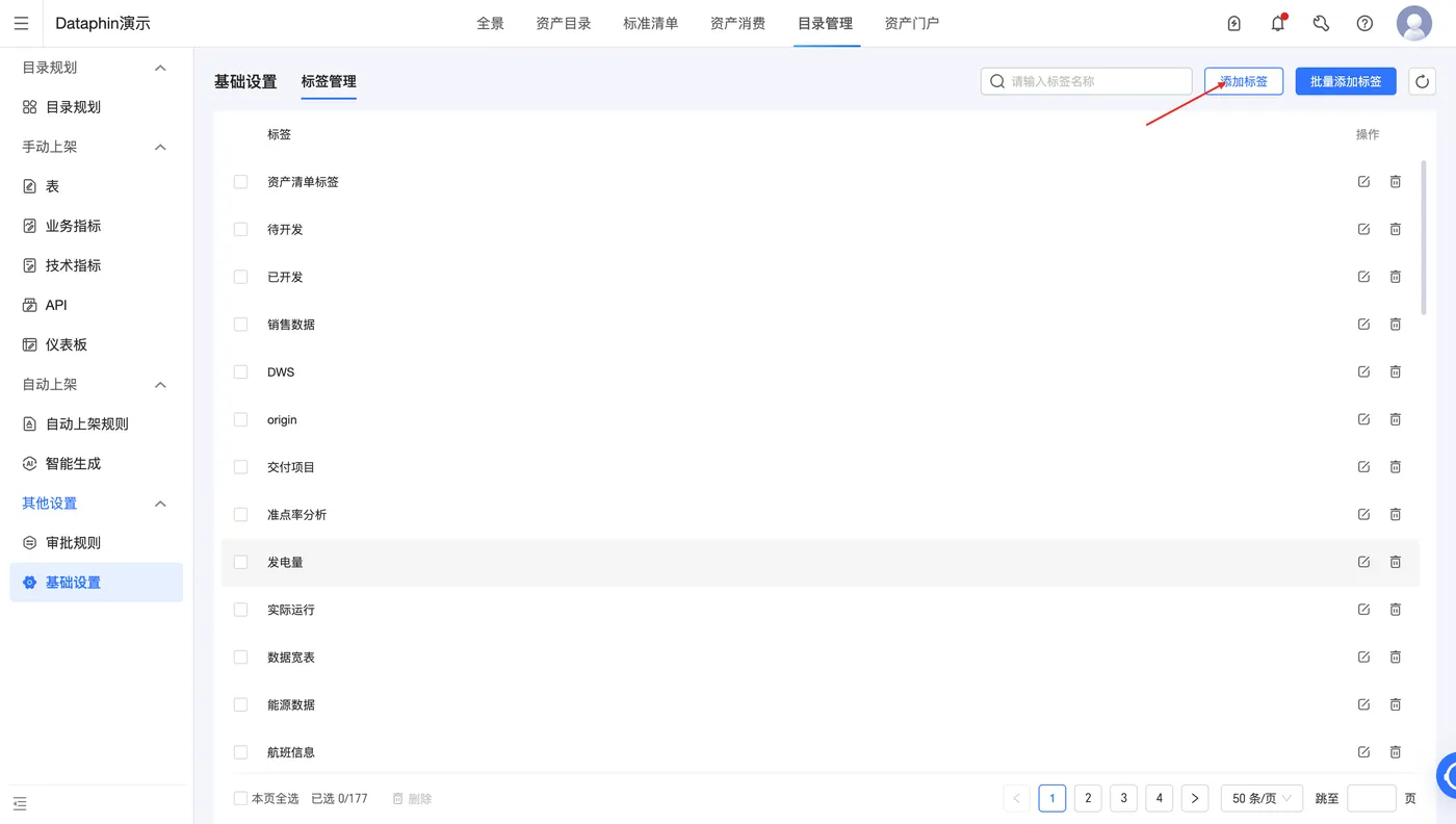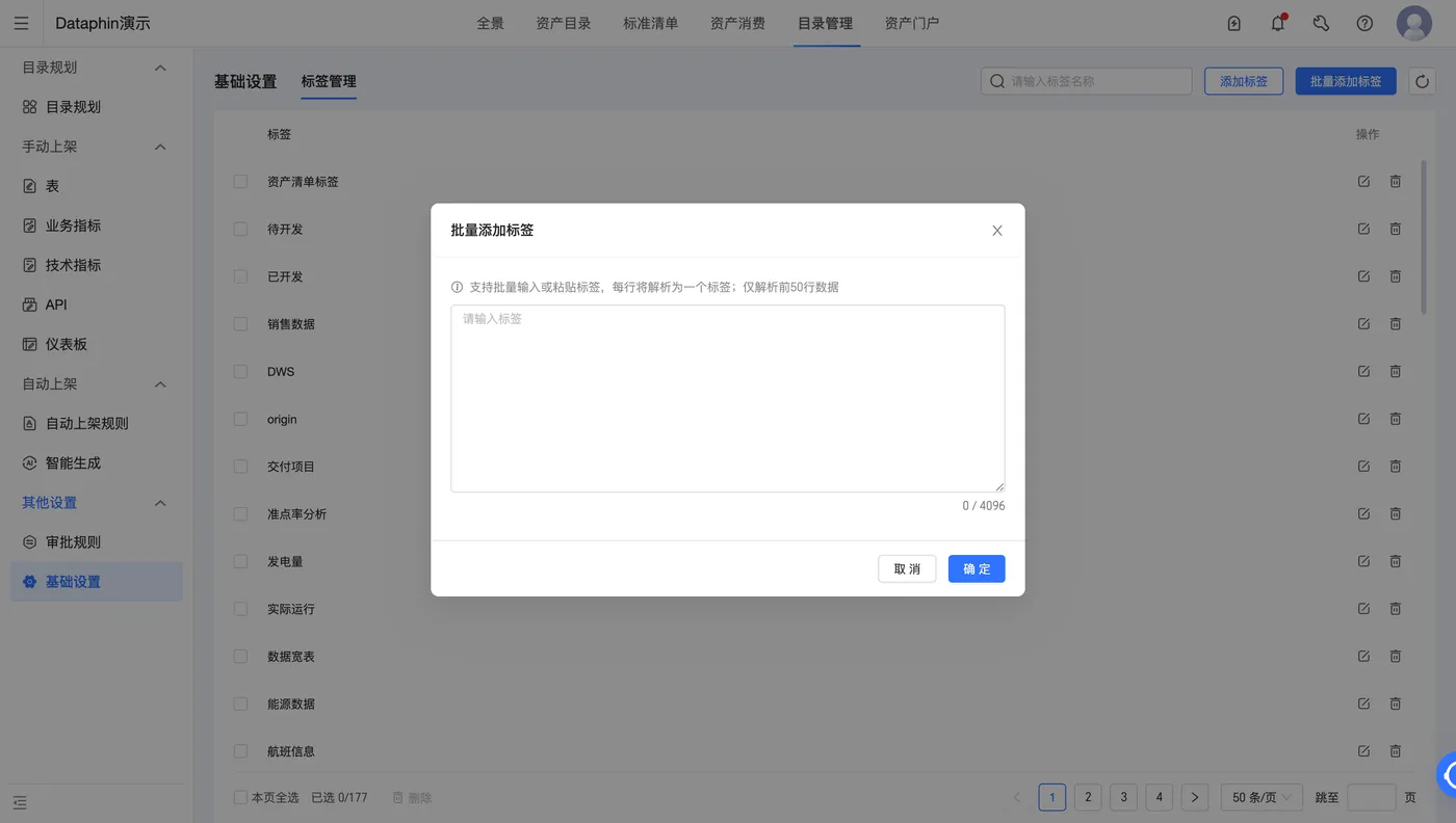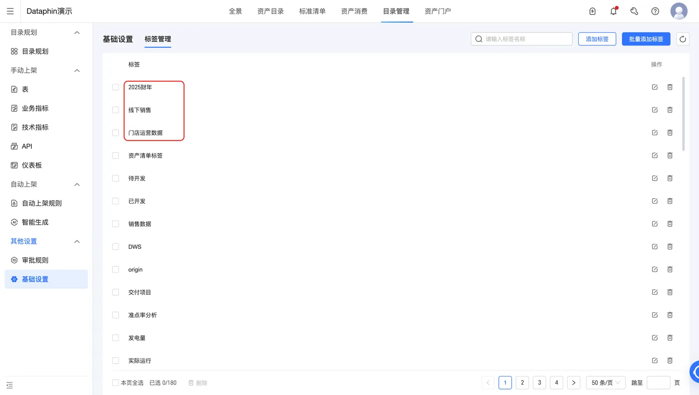 - 在「目录管理」-「基础设置」中,点击「添加标签」,输入我们常用一些标签,并点击 “√” 完成标签创建。例如:“门店运营数据”、“线下销售”、“2025财年”等标签。如果资产标签较多,您可以点击「批量添加标签」,通过快速导入的方式,完善标签体系。