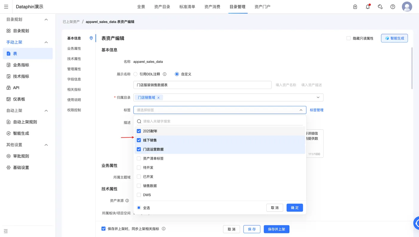 - 接着,我们可以在「资产编辑」页面,给“门店销售表”资产打上这些标签,保存并上架资产。