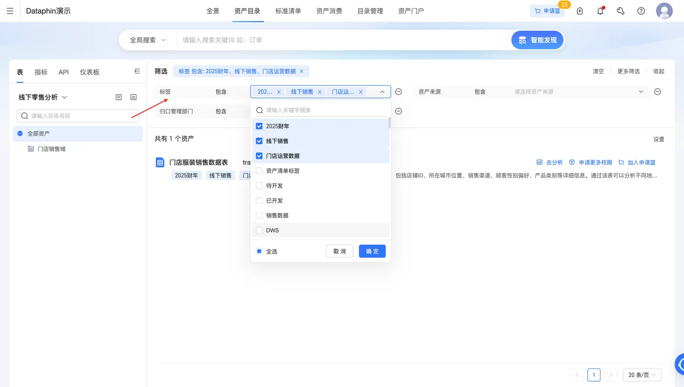 Dataphin 全面优化 资产标签管理 功能,通过标签来标注数据资产,您可以从 业务场景、地域、时间特性 等角度构建灵活的标签体系,帮助团队在高效组织数据的同时提升数据检索和使用的便捷性。以下是以“门店销售表”为例,利用标签功能实现数据检索的操作步骤: