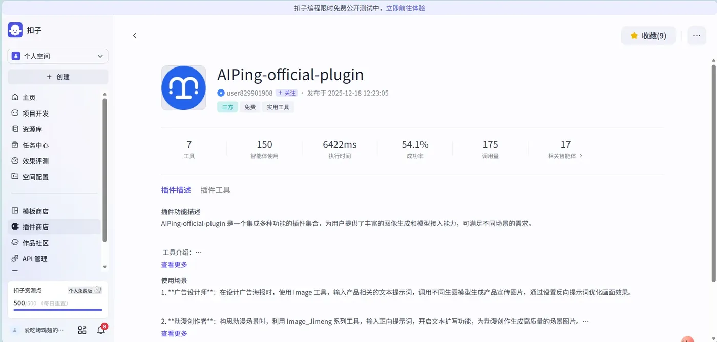 - 进入Coze插件市场,搜索"AIPing-official-plugin"
