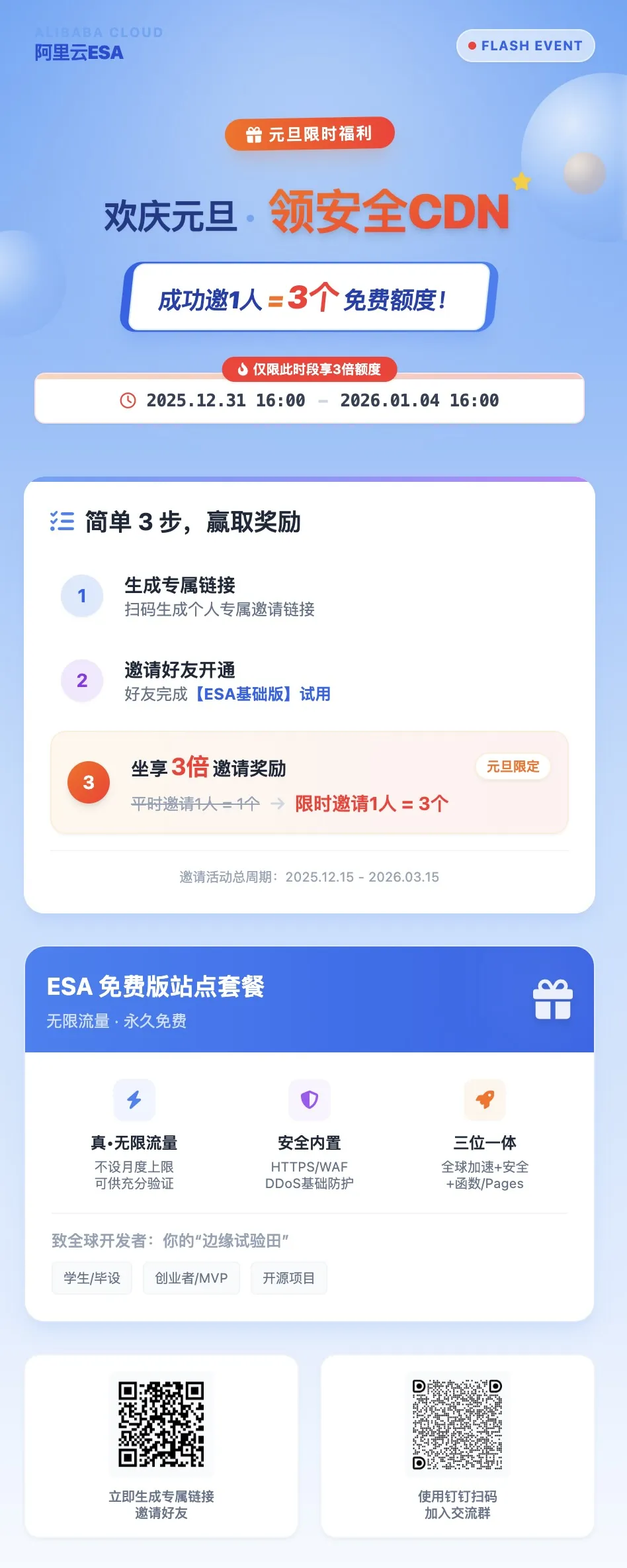 为答谢广大开发者的支持,阿里云ESA诚邀你参与元旦限时邀请加码活动。活动期间,邀请奖励300%升级,为新年储备充足加速动力!