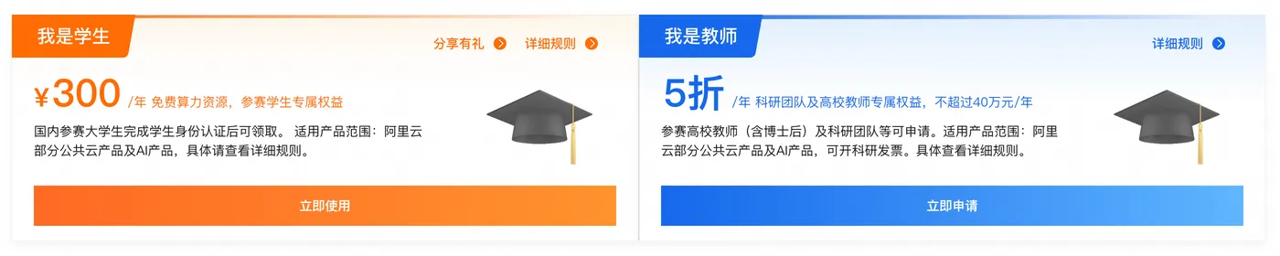 阿里云为参与赛事的所有大学生每人提供300元免费算力资源支持,可用于AI相关作品创意生成设计、视频生成、设计工作流搭建、设计课题实践等;为参与赛事的所有高校带队教师每人支持专属5折算力资源,可用于赛事相关设计研究、课题AI模型训练、赛题带队创作等 。