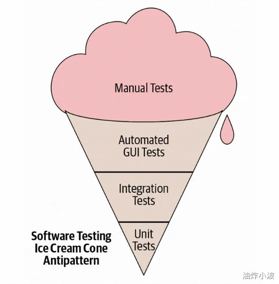 只关注⽤户视⻆的端到端测试、⼤量依赖QA测试都会产⽣如下图所示的反⾯模式。很不幸,这也是在过去的测试体系影响下最常⻅的模式。冰激凌筒模式下,测试套件通常运⾏缓慢、不可靠、难以使⽤。缺失底层的单测也会让项⽬变得⾮常难维护,很难做⼤的改动。