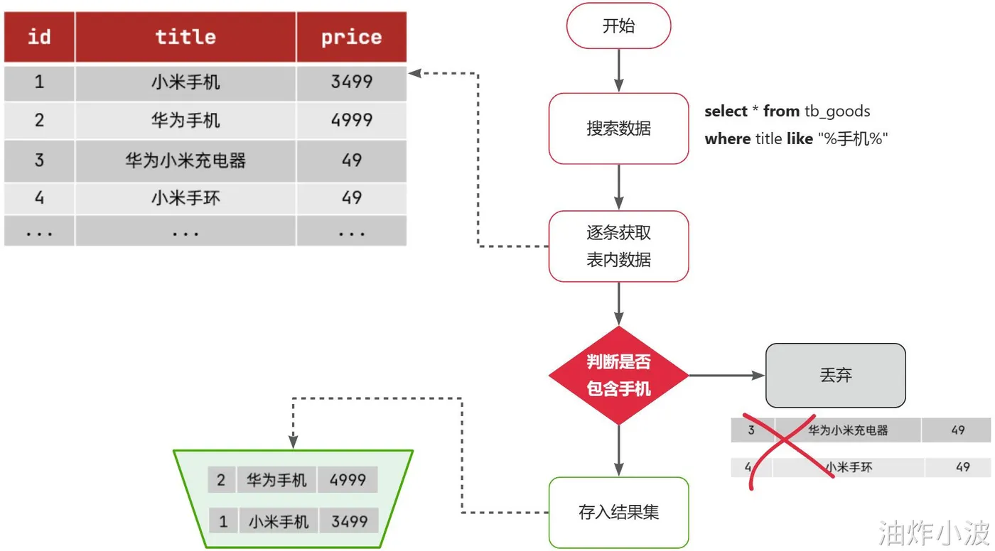 综上,根据id精确匹配时,可以走索引,查询效率较高。而当搜索条件为模糊匹配时,由于索引无法生效,导致从索引查询退化为全表扫描,效率很差。