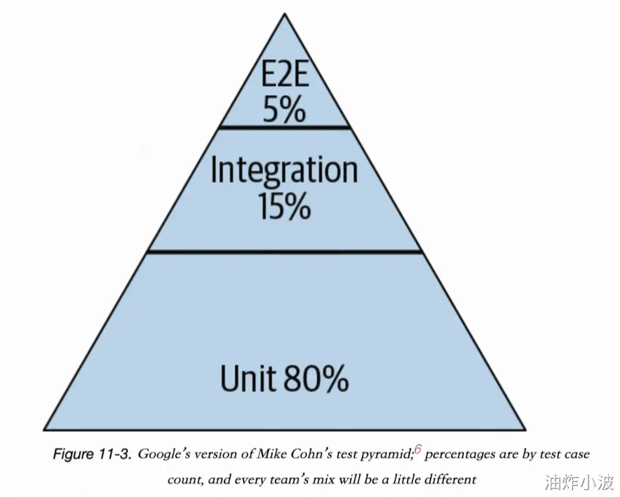 就像盖楼需要从打地基、竖钢筋、灌⽔泥层层往上构建⼀样,测试也有类似的测试⾦字塔架构。下图出⾃《Software Engineering at Google》的测试章节,总结了Google在测试⽅⾯的最佳实践。我们可以看到测试⾦字塔由三层构成,最底层就是单元测试、占⽐80%,是软件系统的地基。再往上是集成测试和端到端测试,分别占15%和5%。因为从下往上占⽐逐层缩减,因此被称为测试⾦字塔(跟盖⾼楼⼀样)。⾕歌推荐的这个⽐例是多年实践出来的结果,意在提升研发的效率(productivity)并提升对产品的信⼼(product confidence)。