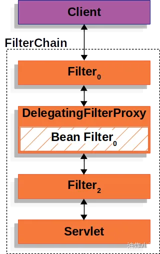public void doFilter(ServletRequest request, ServletResponse response, FilterChain chain) { // 1-延迟获取注册为 Spring Bean 的 Filter Filter delegate = getFilterBean(someBeanName); // 2-将工作委托给 Spring Bean delegate.doFilter(request, response); }