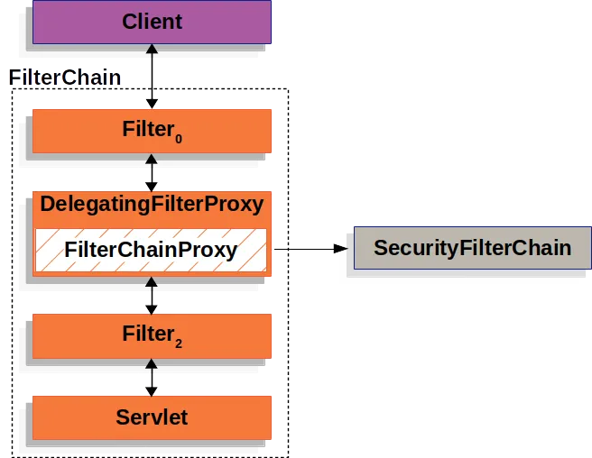 Spring Security 的 Servlet 支持包含在FilterChainProxy。FilterChainProxy是 Spring Security 提供的特殊功能Filter,允许Filter通过 委托给许多实例SecurityFilterChain。由于FilterChainProxy是一个 Bean,因此它通常包装在DelegatingFilterProxy中。