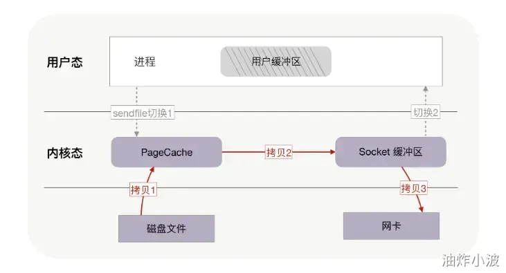 其次,我们应该考虑如何减少内存拷贝次数。每周期中的 4 次内存拷贝,其中与物理设备相关的 2 次拷贝是必不可少的,包括:把磁盘内容拷贝到内存,以及把内存拷贝到网卡。但另外 2 次与用户缓冲区相关的拷贝动作都不是必需的,因为在把磁盘文件发到网络的场景中,用户缓冲区没有必须存在的理由。如果内核在读取文件后,直接把 PageCache 中的内容拷贝到 Socket 缓冲区,待到网卡发送完毕后,再通知进程,这样就只有 2 次上下文切换,和 3 次内存拷贝。