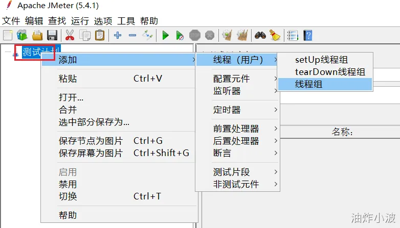 在测试计划上点鼠标右键,选择添加 > 线程(用户) > 线程组: