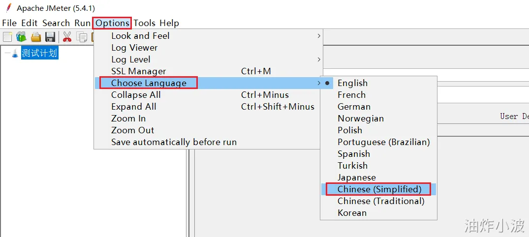 默认Jmeter的语言是英文,需要设置: