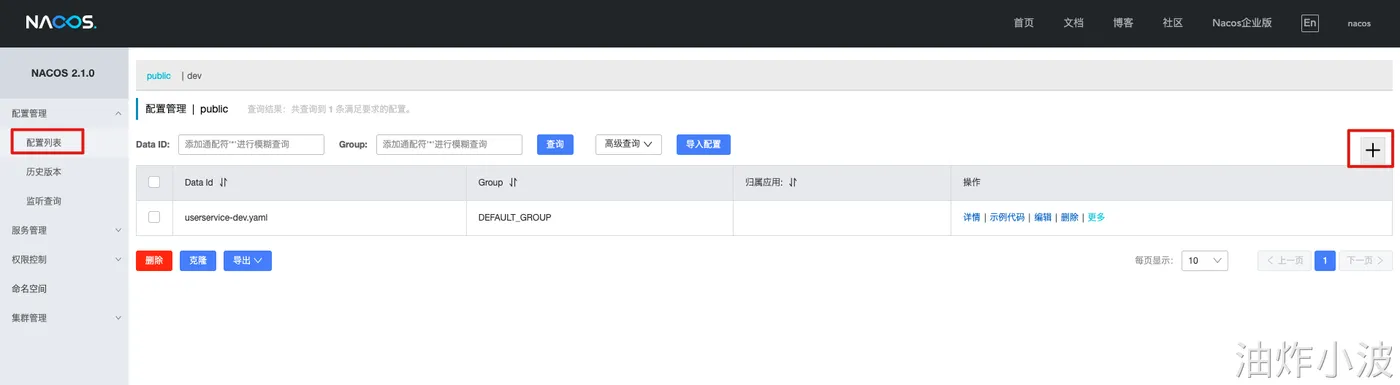 Nacos实现配置中心较为简单,首先在服务端新增一个配置信息(profile指项目运行环节:dev/test/pro)