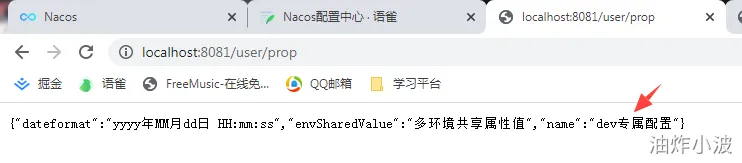 因我们目前只有dev、公共两部分配置信息,所以profile=dev可以读取到dev + 共享,而profile=test的因没有test配置信息,因此只能读取共享信息。验证生效,效果如下:
