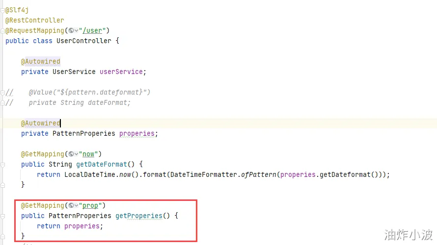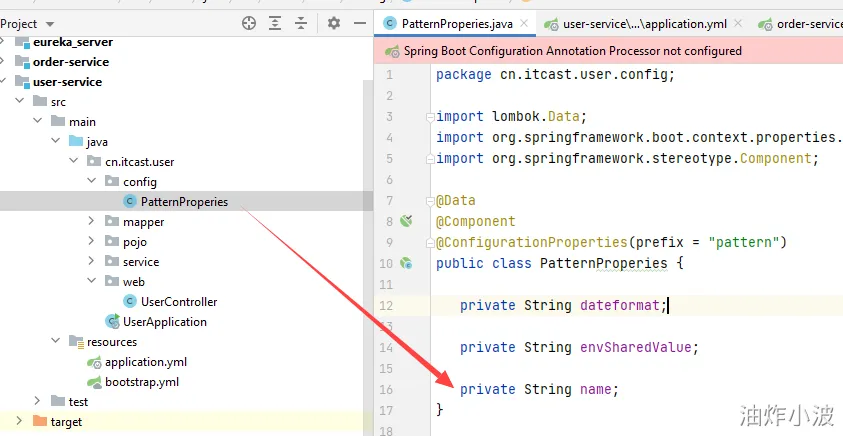 我们在user-service工程中新增一个配置类,用于读取此例中配置信息,代码如下: