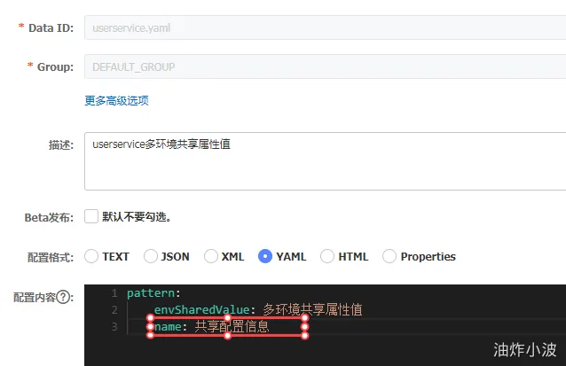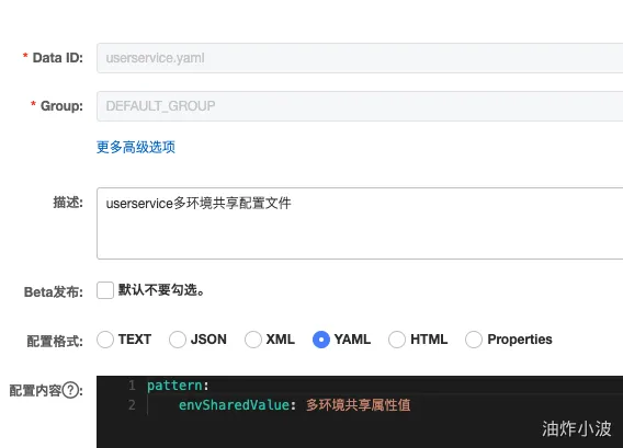在nacos服务端新增一个:userservice.yaml文件,此文件没标识任何环境信息