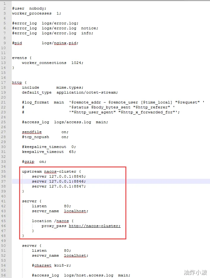 其中upstream后nacos-cluster为配置项名称KEY,我们给三个ip+端口配置进去VALUE,当访问localhost:80端口 + /nacos后,就自动对访问路径http://key中key对应的value做负载均衡。
