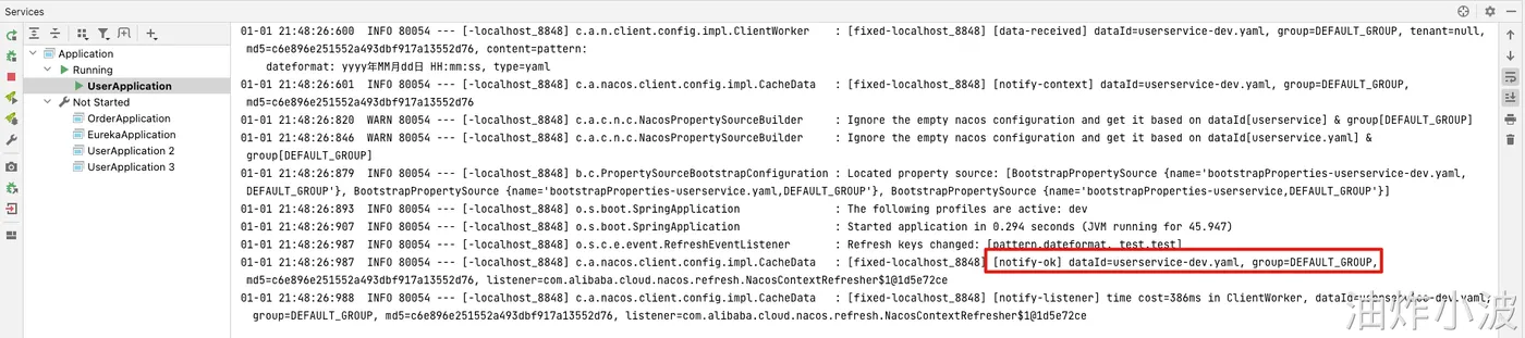 实际当用户修改配置文件时,nacos会通知客户端此时配置更新,日志如下: