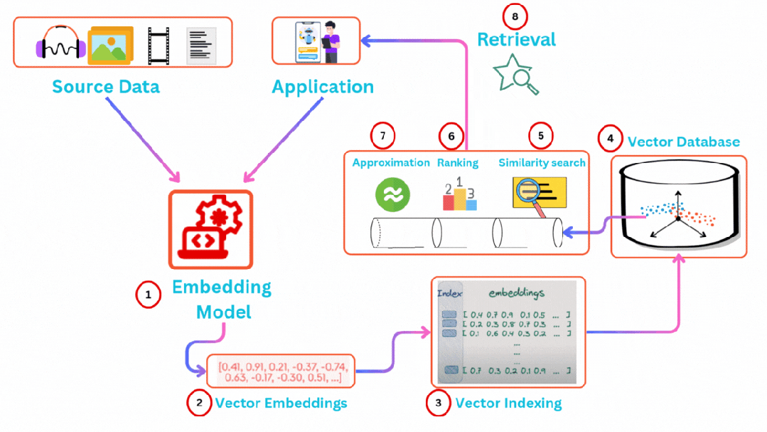 向量数据库的工作原理主要围绕高维向量数据的嵌入存储、索引构建和高效检索展开,其核心目标是通过优化数据结构和算法,在大规模高维数据场景下实现快速的相似性搜索。向量数据库通过向量索引技术(如HNSW、IVF-PQ)和近似最近邻搜索(ANN),解决了传统数据库无法高效处理高维向量数据的问题。其核心在于将非结构化数据转化为向量表示,并通过优化索引和算法实现快速相似性检索