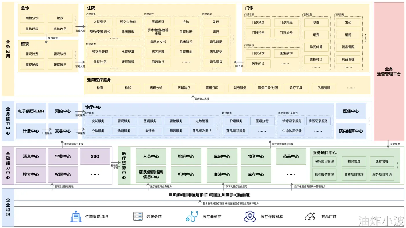 如图所示,我们可以将业务应用层分为门诊、住院、急诊、留观和通用医疗服务这五个模块,每个模块都可以在细化其功能矩阵。
