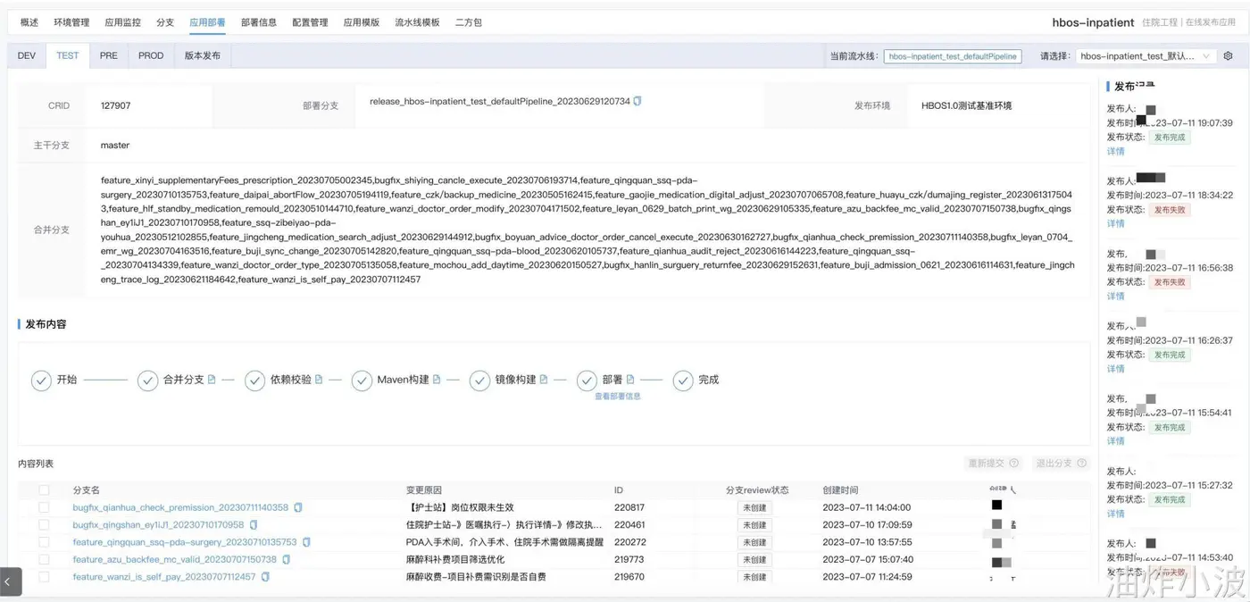 当用户需要发布时,只需要进入对应的环境(这里我们以test为例),勾选所需要发布的分支,即可实现自动化部署。下图可以看到test环境同时部署分支约20个。