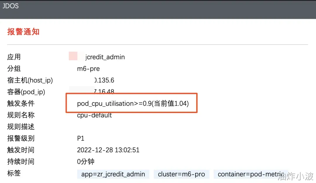 问题起因是我们收到了jdos的容器CPU告警,CPU使用率已经达到104%