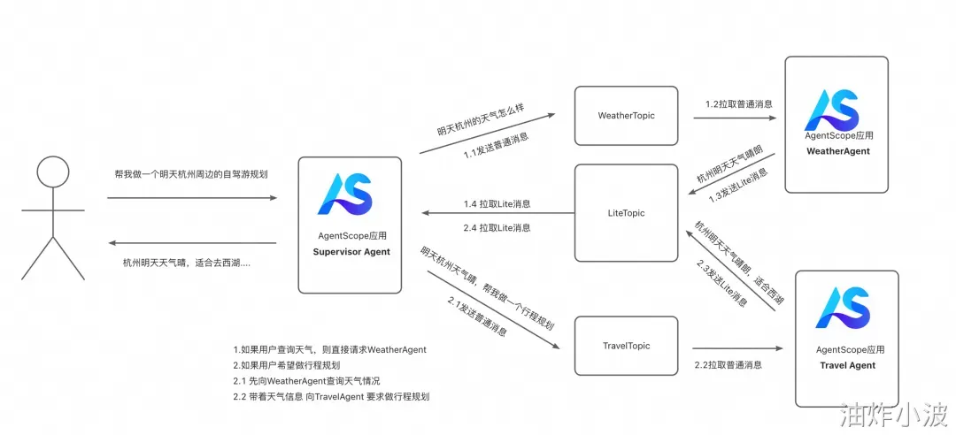 ●如果用户希望做出行程规划,则先向 WeatherAgent 发出天气查询请求,获取对应天气信息后,再带着天气信息向 TravelAgent 发出行程规划请求,TravelAgent 对行程结果进行规划后将响应结果发送至 SupervisorAgent 订阅的 LiteTopic,SupervisorAgent 应用将结果发送至用户侧。