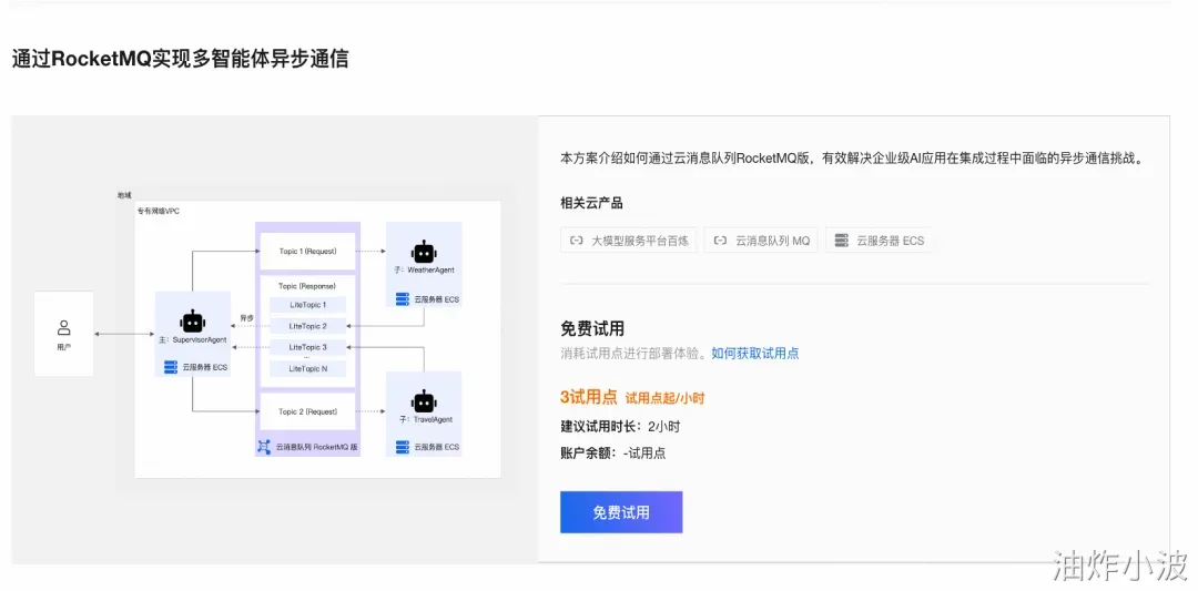 阿里云官网现已提供免费试用、一键部署的《RocketMQ for AI:企业级 AI 应用集成的异步通信方案》,带您亲手搭建并运行一个多智能体应用,并基于 RocketMQ LiteTopic 实现多智能体异步通信能力——具备持久化、高可靠、可追溯等特性,显著提升 AI 应用交互的稳定性与可观测性。