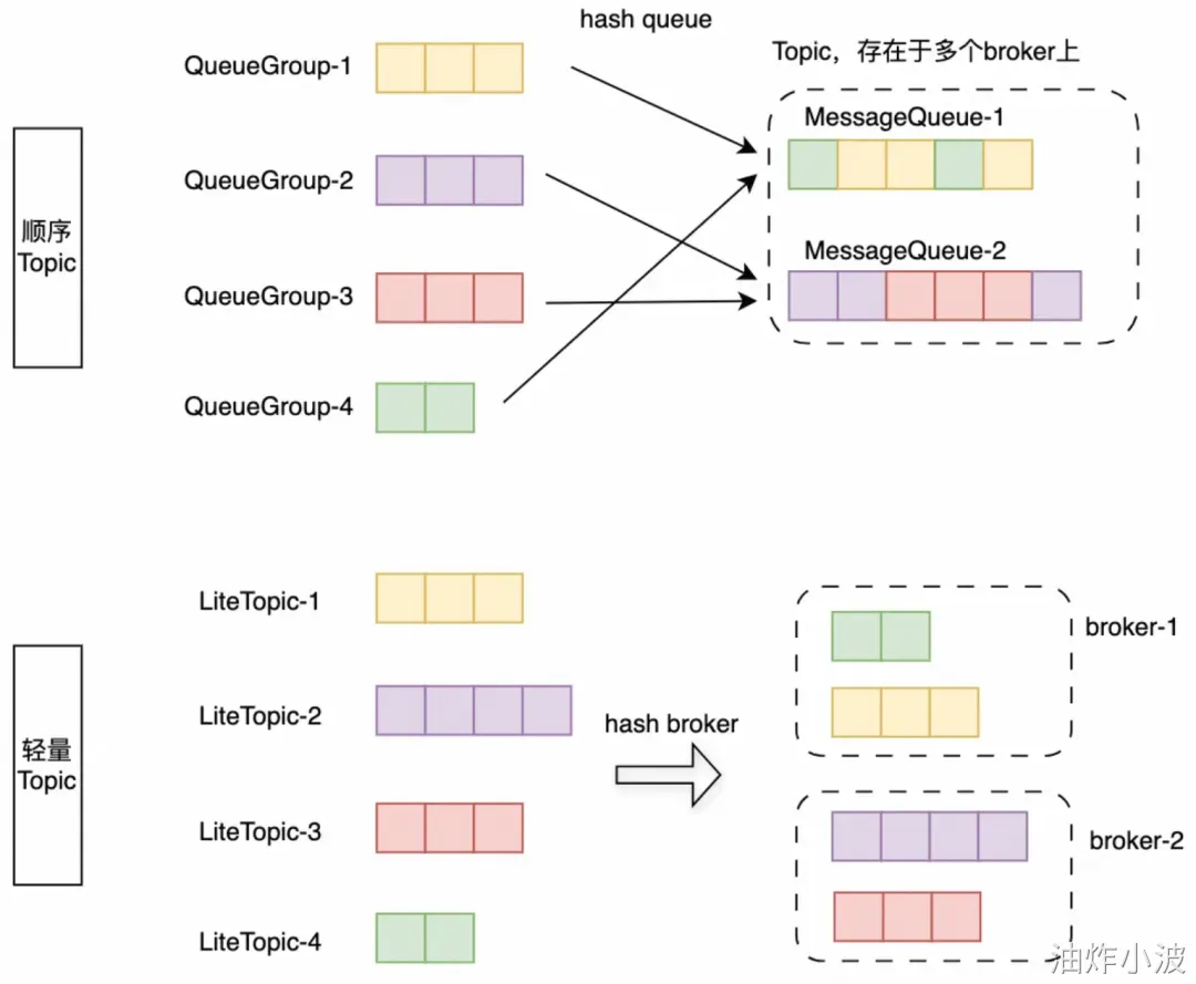 ●轻量级的 LiteTopic 在消息分配与发送行为上与顺序 Topic 一致(其所属 Queue 由单一 Broker 独占,消息始终路由至该 Broker,而非在多个 Broker 间轮询发送),这种设计天然确保了消息的严格顺序性,并极大降低了资源管理和路由的复杂度。