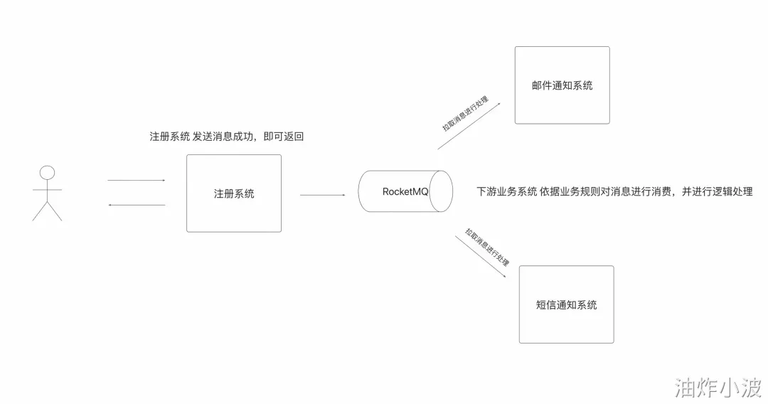 下图以注册系统为例:用户发起账户注册请求后,注册系统向 RocketMQ 发送“新用户注册”的消息后便立即返回,无需关心下游的邮件或短信通知系统如何处理。邮件或短信通知系统再分别从 RocketMQ 拉取消息,驱动各自的发送流程。整条业务链路为单向、无反馈的事件驱动模式。
