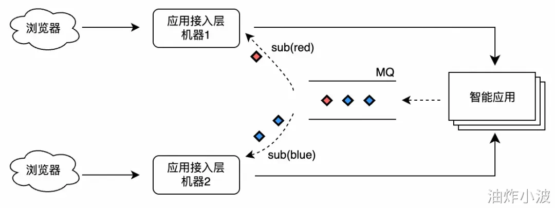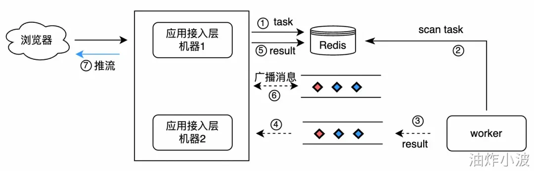 4结果推送:应用接入层节点收到广播消息后,仅当结果归属于自身连接时,才从 Redis 获取完整结果并推送给客户端;否则直接忽略该消息。