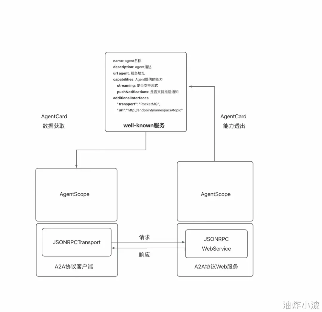 当 AgentScope 作为 Agent 应用服务提供者时,其内部支持符合 A2A(Agent-to-Agent)协议的多种通信方式,包括基于 JSONRPC 的 WebService 和 RocketMQ Service,用于接收并处理来自其他 Agent 的 A2A 协议请求。同时,AgentScope 通过 well-known 服务接口向外标准化地透出其所承载 Agent 的核心能力信息,包括但不限于: