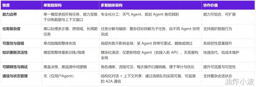 在深入探讨如何构建 A2A 通信之前,我们首先需要理解,为什么多智能体协同是必然趋势。我们从六个维度对比单智能体与多智能体的能力差异: