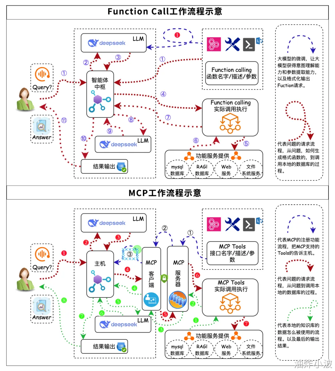 MCP(模型上下文协议)Function Call(函数调用)在大模型应用开发中是两种关键技术,它们在提升大模型能力与拓展应用边界方面发挥着重要作用,同时二者在功能、实现方式等方面存在显著差异,且在某些场景下相互关联、相互补充。MCP 搭建了大模型与外部世界沟通的 “桥梁”,而Function Call则是大模型在通过这座 “桥梁” 后,在外部世界中执行具体任务时的 “工具”。