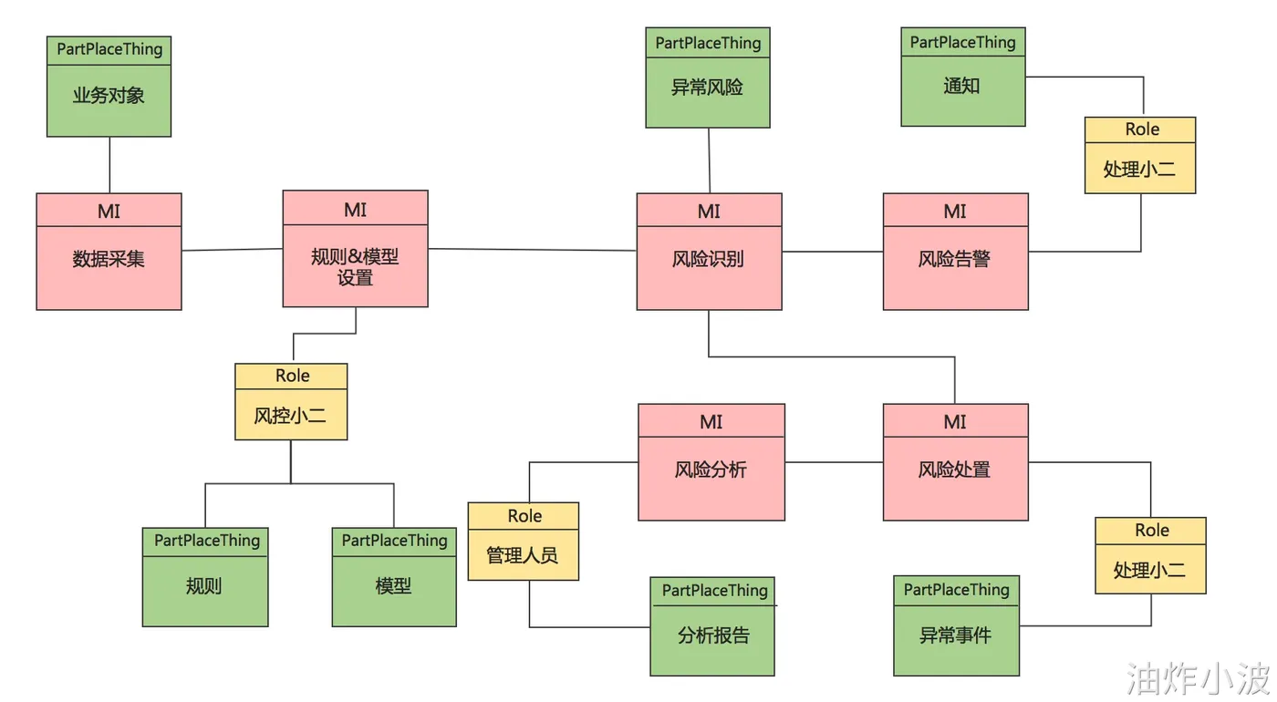 Part-Place-Thing Archetype(参与方-地点-物品原型):业务对象、规则、模型、异常风险、通知、异常事件、分析报告(PPT 使用绿色表示)。