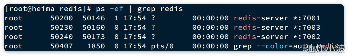 ps -ef | grep redis # 结果: root 4822 4743 0 14:29 ? 00:00:02 redis-server *:7002 [cluster] root 4827 4745 0 14:29 ? 00:00:01 redis-server *:7005 [cluster] root 4897 4778 0 14:29 ? 00:00:01 redis-server *:7004 [cluster] root 4903 4759 0 14:29 ? 00:00:01 redis-server *:7006 [cluster] root 4905 4775 0 14:29 ? 00:00:02 redis-server *:7001 [cluster] root 4912 4732 0 14:29 ? 00:00:01 redis-server *:7003 [cluster]