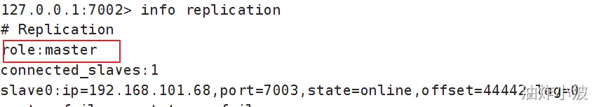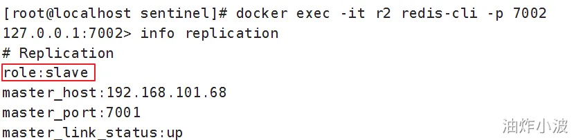 # 连接r1 docker exec -it r1 redis-cli -p 7001 # 查看集群状态 info replication