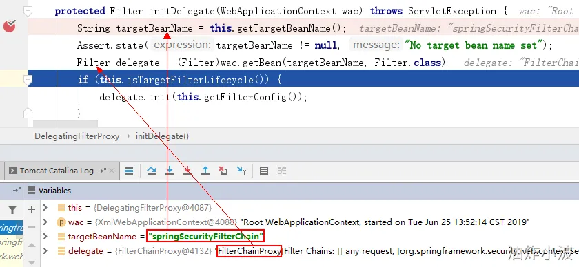 由此可知,DelegatingFilterProxy通过springSecurityFilterChain这个名称,得到了一个FilterChainProxy过滤器, 最终在第三步执行了这个过滤器。