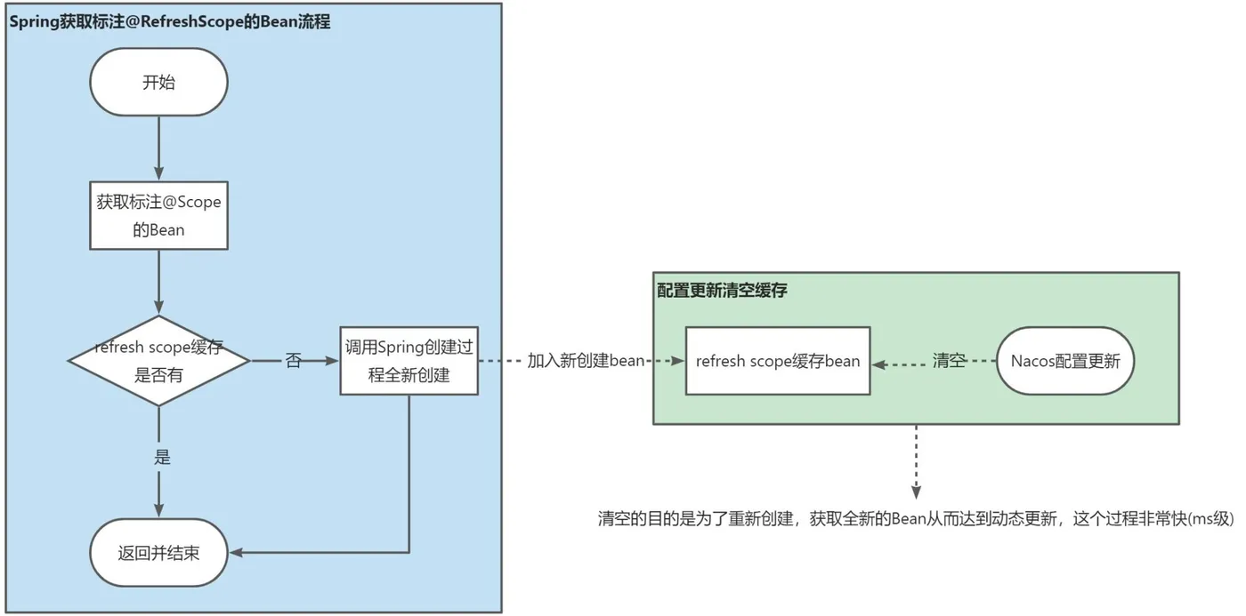 @RefreshScope主要就是基于@Scope注解的作用域代理的基础上进行扩展实现的,加了@RefreshScope注解的类,在被Bean工厂创建后会加入自己的refresh scope 这个Bean缓存中,后续会优先从Bean缓存中获取,当配置中心发生了变更,会把变更的配置更新到spring容器的Environment中,并且同时bean缓存就会被清空,从而就会从bean工厂中创建bean实例了,而这次创建bean实例的时候就会继续经历这个bean的生命周期,使得@Value属性值能够从Environment中获取到最新的属性值,这样整个过程就达到了动态刷新配置的效果。