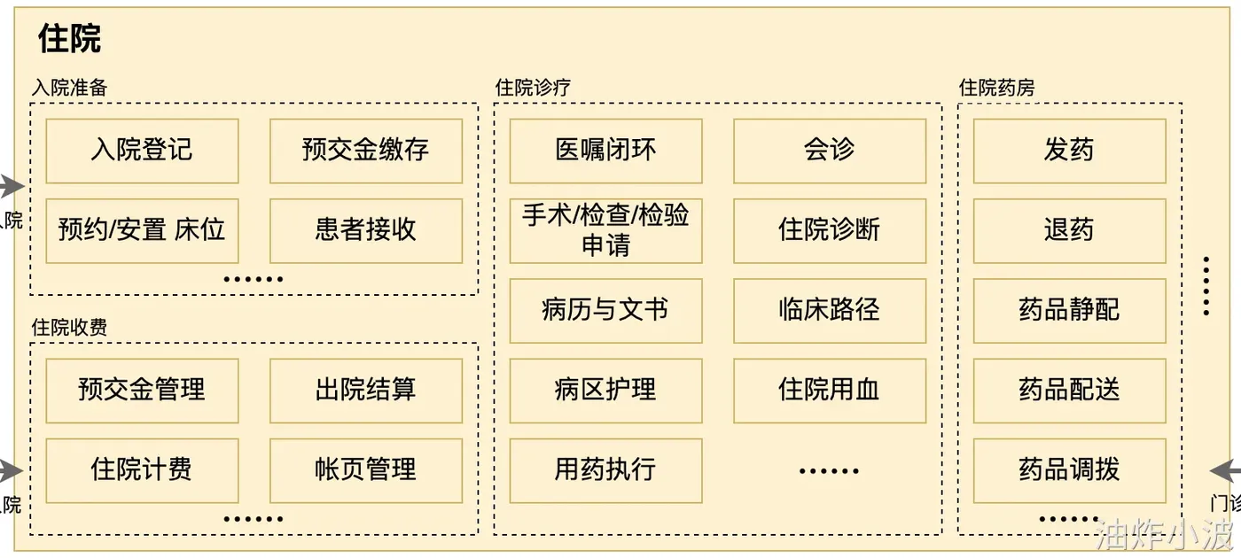如图在住院中,可以分为入院准备、住院诊疗、住院收费、住院药房等独立的功能模块,各个功能模块由同类功能聚合而来。