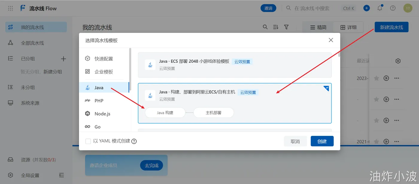 - 代码上传后,用户就可以提交,当认为可以发布时,我们就可以创建流水线
