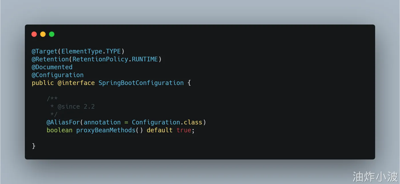 官方给的解释也是:@SpringBootConfiguration 是对 @Configuration注解(这个我们可能就比较熟悉了,不了解的参考:@Configuration)的一种封装,在上图我们也可看出,其核心作用是:标注在配置类上,且是主启动类(如果@Configuration标注就不必强调是主启动类),基于这个注解,其所在的包路径位置获取之后EnableAutoConfiguration(第4节详细论述)注解扫描的依据,进而扫描出配置文件。
